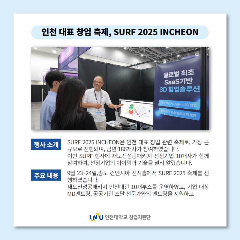 인천시, 인천지방중소벤처기업청 등과 함께, 인천 최대 창업 행사 'SURF 2025 INCHEON'을 지난 9월 23일부터 24일까지 송도 컨벤시아 전시홀 3,4에서 이틀 간 진행하였다.