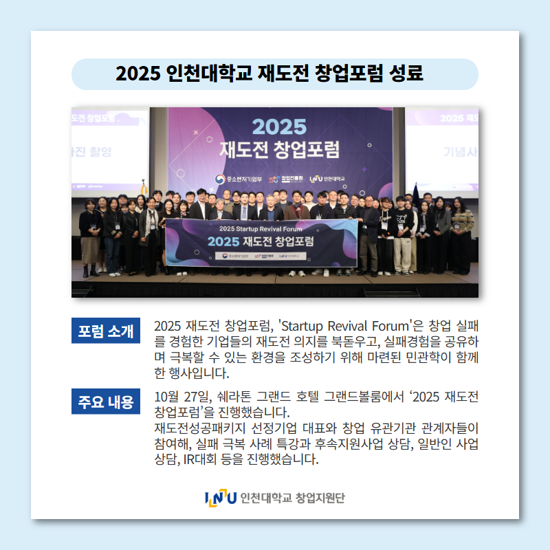 인천대학교 창업지원단은 10월 27일 송도 쉐라톤 호텔에서 ‘2025 재도전 창업포럼’을 성황리에 개최했다.