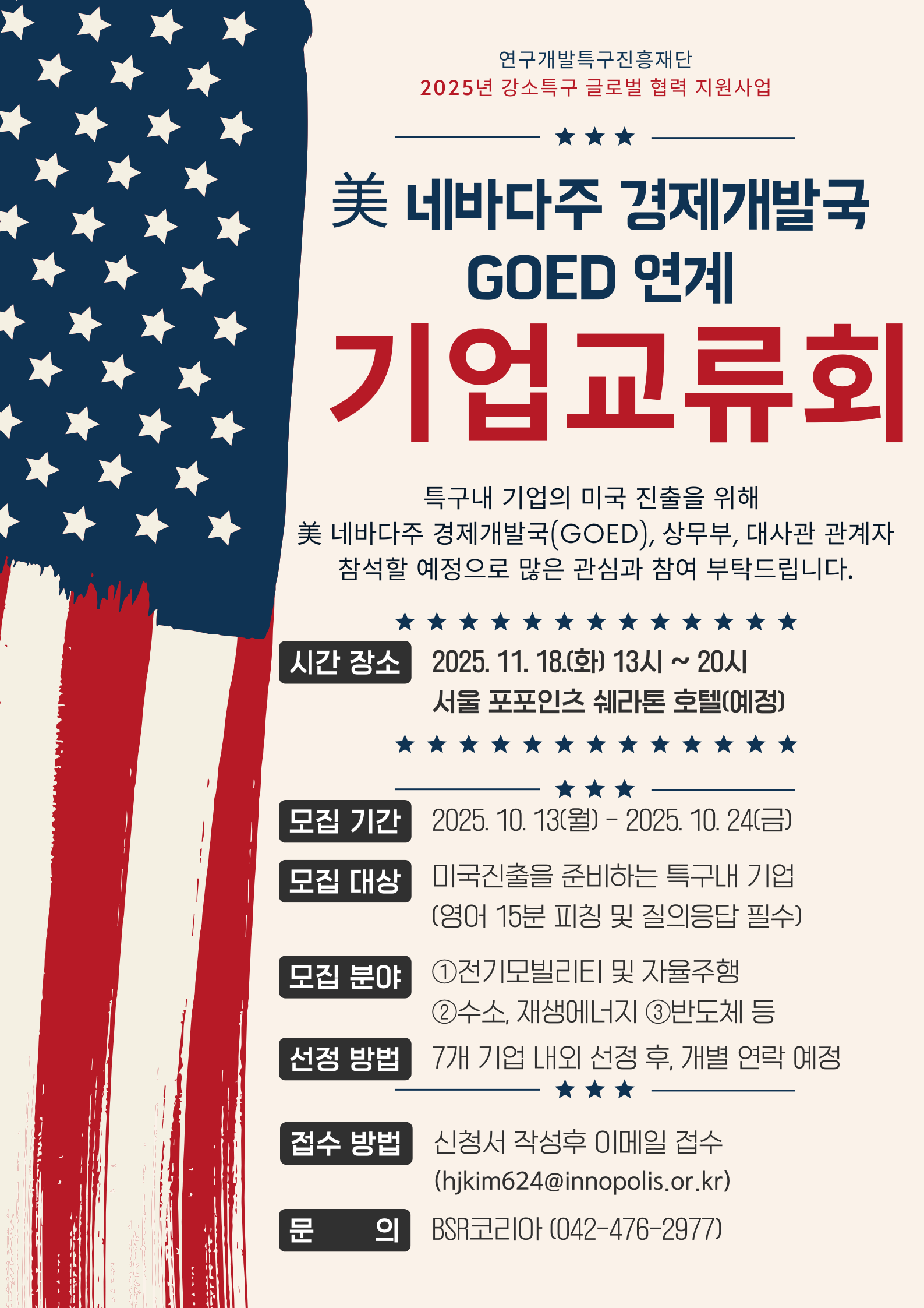 「2025 美 네바다주 경제개발국(GOED) 연계 기업교류회 」를 추진하고자 합니다.